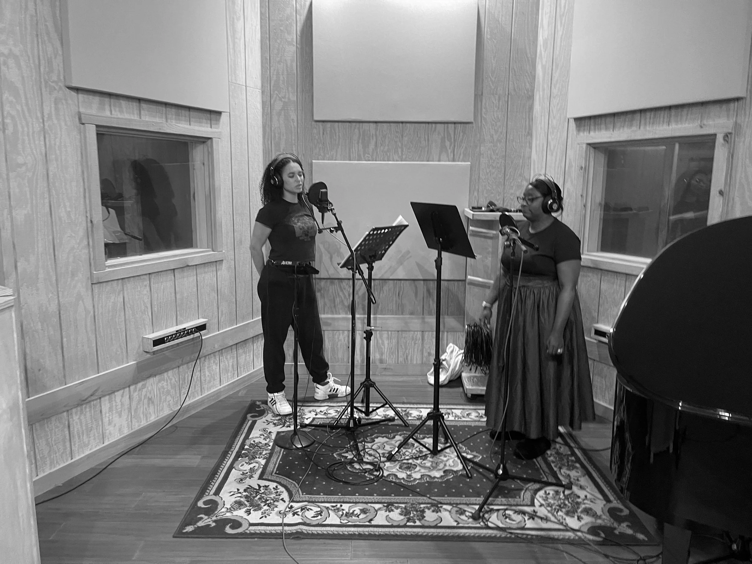 Georgia Heers and Deneen Jones singing at Spectra Sound Recording in Quakertown, PA during ๐‘ช๐’๐’Ž๐’‘๐’๐’†๐’•๐’Š๐’๐’ recording sessions.