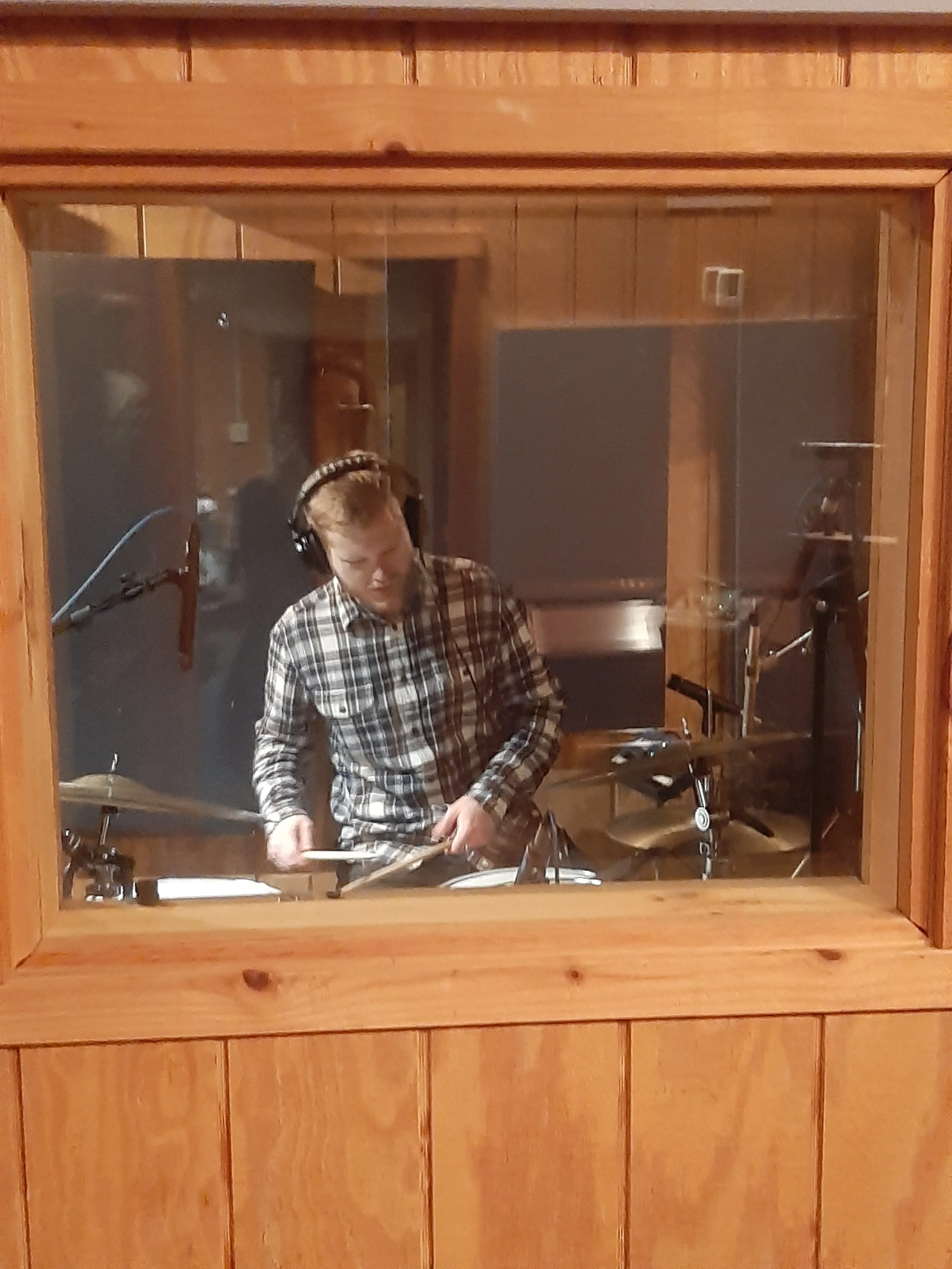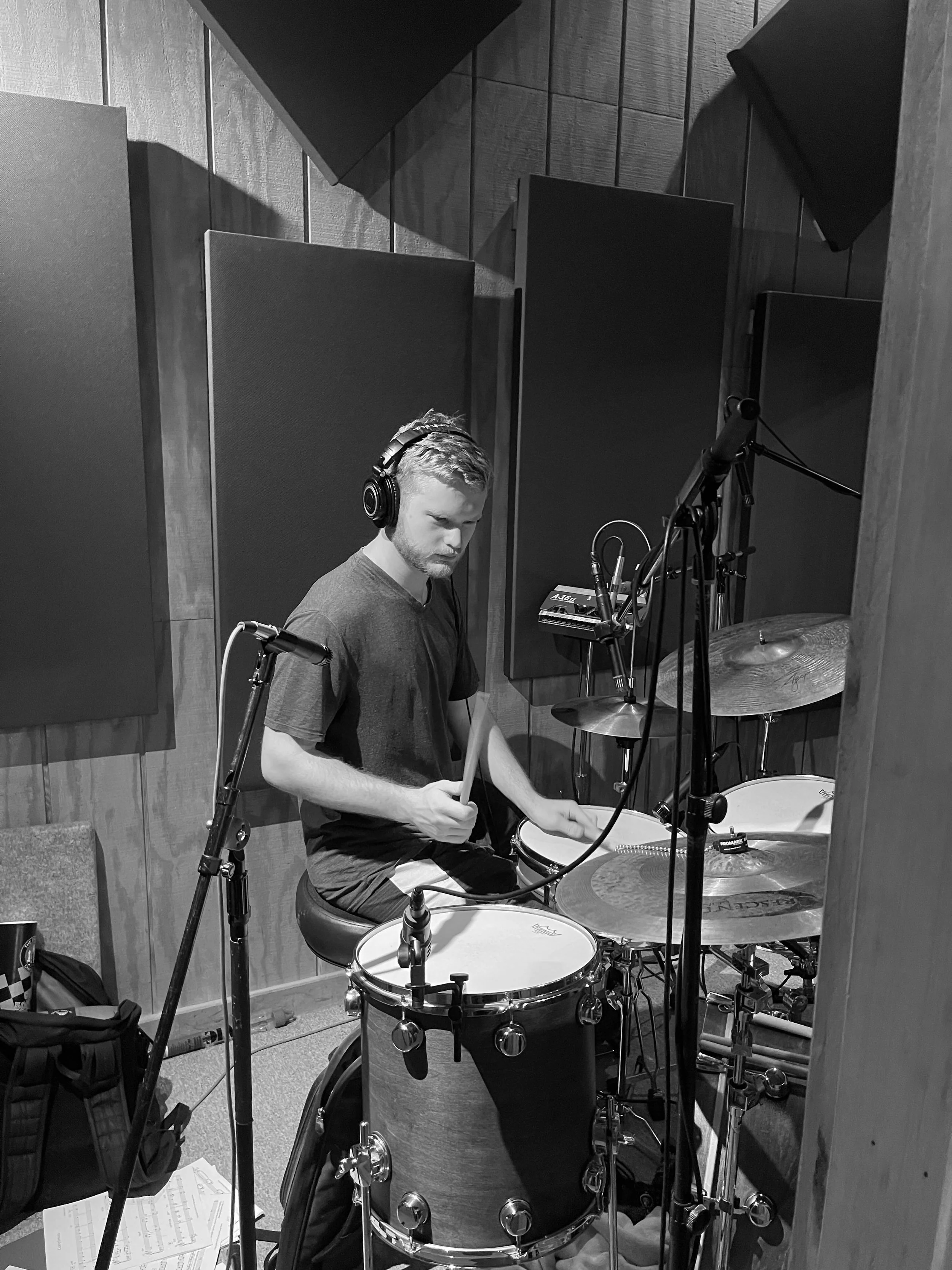 Hugh Kline on drums. Playing at Spectra Sound Recording in Quakertown, PA during ๐‘ช๐’๐’Ž๐’‘๐’๐’†๐’•๐’Š๐’๐’ recording sessions.